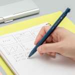 ボディを振るだけで芯が出る“フリシャ機能”を搭載。ノック時と筆記時でペンを持ち替えることなく、片手でペンを持ったまま素早く芯を出し、そのまま書き始めることができます。