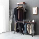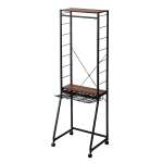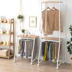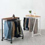 本体の上部に木目調の天板が備わっており、また耐荷重は10kgとハンガー以上に余裕があるので、さまざまなものを置くこともできます。ちなみにハイタイプは、下段のスラックス部に棚板、上段の上着掛けに天板が配されています。脚部にはキャスターが備わり、移動がスムーズに行えます。