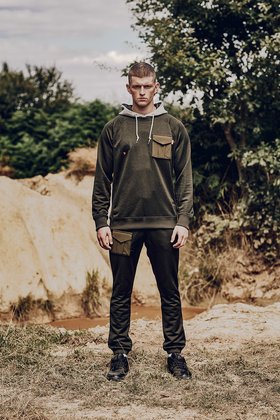ジャケット、パンツ、スウェット、Tシャツ、フード、そしてウエストバッグの計8アイテムのラインナップ。
