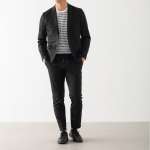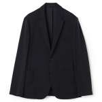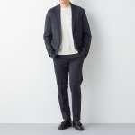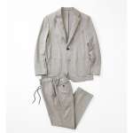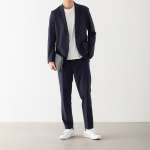 ハリ感と光沢感、適度な厚みとストレッチ性が備わっており、軽い着心地を有しながらもビジネスシーンでも違和感なく着用できます。ジャケットは襟付きで、スーツスタイルから上下で別カラーを合わせたジャケパンスタイルまで、幅広い着回しに対応。