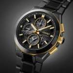 オールブラックのクールな外装に、サブダイヤルを囲むフレームや時分針、りゅうずやプッシュボタンに煌びやかなイエローゴールドの差し色をあしらった力強いデザインは、地球のはるか上空を回っている人工衛星から眺めた夜の情景をイメージしたもの。