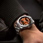 「オービター3」のカプセルと同じ鮮やかなオレンジのダイヤルを備え、数字とインデックス、時分針にはスーパールミノバを塗布。夜間暗所での時刻確認がスムーズに行えます。時計ケースはチタン製で、シースルーのケースバックに「ブライトリング オービター3」のシルエットをデザイン。