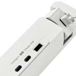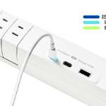 Type-Cポートはポート部分にLEDライトが搭載されていて、青(超高速)、水色(高速)、緑(普通)と色によって充電速度が一目瞭然。タップの端には雷サージガードとブレーカー内蔵一括スイッチも搭載されています。