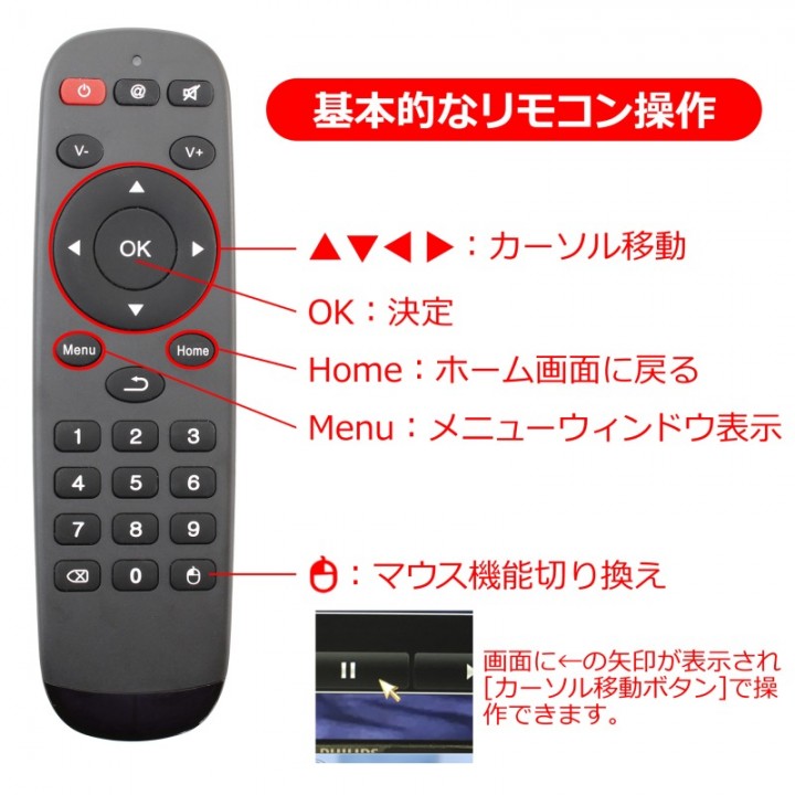 付属の専用リモコンにはマウス機能がついているので操作もラクラク。USBポートにマウスを接続して操作することもできます。
