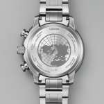 時分針とセンター秒針、デイデイト&24時間表示と時計としての基本機能は極めてシンプルですが、ユニークなのは6時位置に配された、北半球の図が描かれたサブダイヤルの存在です。