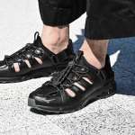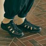 アッパーは人工皮革とメッシュ素材を組み合わせ、すき間を設けたサンダルのような開放感のあるデザイン。サンダルでケガをしやすいつま先をカバーするクローズトゥタイプです。シューレースとストッパーも搭載し、簡単にフィット感を調節できます。