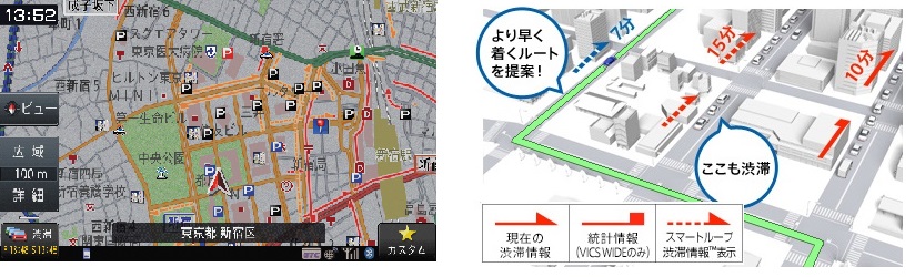 また、「VICS WIDE」に対応しており、より高精度な渋滞回避ルートの案内が可能なうえ、台風などの気象情報や津波の発生・火山の噴火などリアルタイムの特別警報情報なども取得できる。