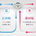 さらにオートスイング機能は室内の広さや人のいる場所に応じて2段階の角度調整と、同じく2段階の速度調整に対応。リモコンでも音声認識でも作動します。またファンの回転方向通常と逆にすれば空気を吸い込んで天井側に吐き出させることもできるので、暑い夏場はもちろん、寒い季節も一年中活用できるのもうれしいポイントです。