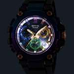 グラデーションIPを大胆にあしらったメタリックベゼルはカシオお得意のデザインですが、今回のモデルでは広大な宇宙空間に輝く散光星雲をモチーフに、ブルーからパープルに不規則な濃淡を織り交ぜながら移ろいゆくグラデーションカラーを採用。