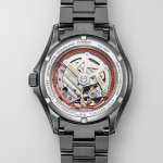 裏蓋はスケルトン仕様で、ムーブメントの動きをリアルタイムで確認するという機械式腕時計ならではの楽しみ方が味わえます。また、表側同様に差し色の赤が使われているのも特徴的です。