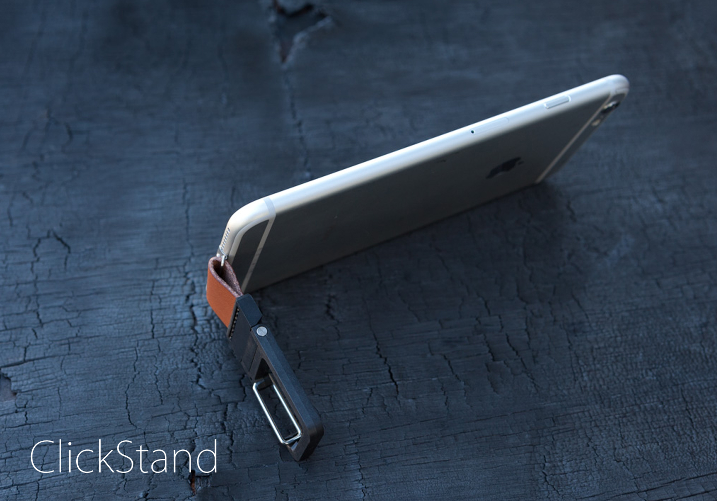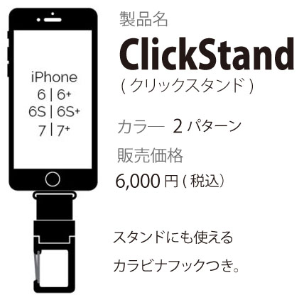 ▲カラビナフック付きでスタンドとしても使える「ClickStand(クリックスタンド)」。
