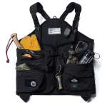 各ポケットの位置に合わせてギアループを配置しているので、各ギアやサングラスなどの小物を吊り下げることも可能です。ベストの前留めはマグネット式でつかみやすい取っ手紐も付いているので、グローブを嵌めていても着脱しやすい仕様。
