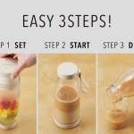 マイボトルブレンダーの使い方は、簡単3ステップ。1、野菜やフルーツ、プロテインなど好きな食材を入れてセット。2、ボタンを押して撹拌スタート。3、出来上がったらそのまま飲んでも、注いでもOK。コードレスなのでボトルごと持ち歩けます。