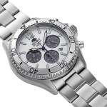 過去のクロノグラフモデルと同様に、6カ所の窪みが設けられた逆回転防止ベゼルを備え、ホワイトカラーの文字板にはきめ細かな光沢仕上げの金属板を採用。