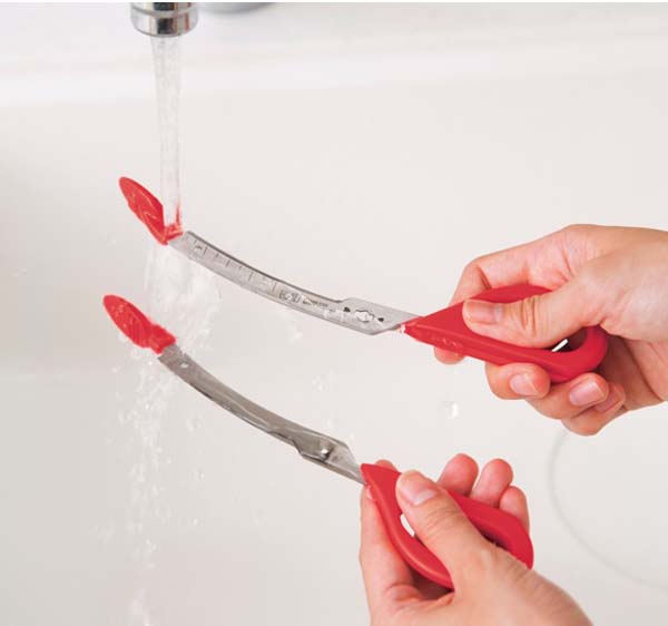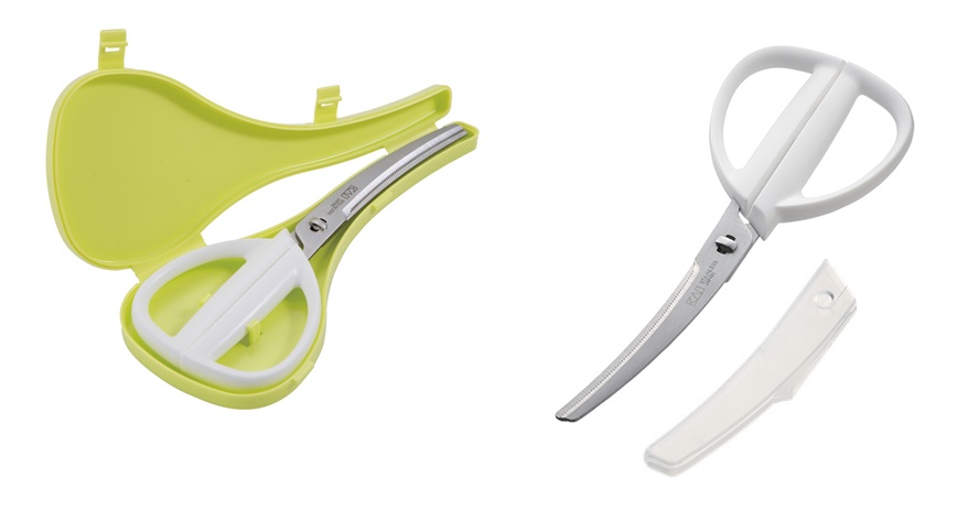 ハサミとしては、カーブのついたセレーション刃が食材をしっかりとらえ、固いものから転がりやすいもの、すべりやすいものまで確実にカット。刃には食材をカットする際のサイズの目安になる便利な目盛りがついている。左右2本に分解できて洗いやすいのは、衛生面でも安心だ。2016年9月より発売中、価格は2160円。