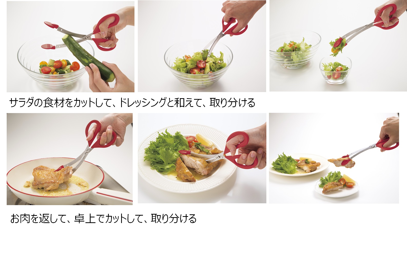 例えば「フライパンの上で肉を返して焼き具合を確認、食べやすくカットしてサーブする」といったように、食材をつかんで切って取り分けるという一連の流れを、持ち替えることなく1本でこなせる。