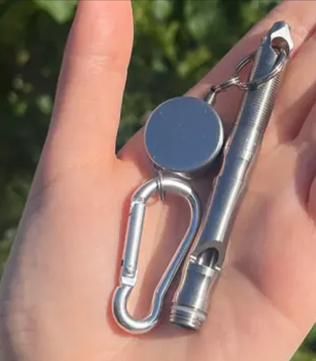 Makuakeにて先行販売中の「チタン製 4in1 マルチホイッスル FINDME」(8750円~ 6月5日現在)は、ホイッスル、ガラスブレーカー、メモホルダー、ミニカッターの機能を備えたマルチ仕様のホイッスル。軽くて丈夫なチタン製で、携帯にも便利なポケットサイズと、いざというときに備えて常に持ち歩いておきたいツールです。