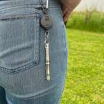 サイズは長さ約8.5cm×直径約9.5mmで、重さは約15g。メタル製アクセサリーのようなデザインが印象的なホイッスルです。一般的な金属製品の製造に用いられるプレスや鋳造ではなくチタンインゴットから削り出す旋盤加工で製作しており、部位によるひずみや歪みが少なく、金属疲労が起きにくい仕様になっています。チタンの特性である軽量性と高硬度、錆びへの強さと耐久性をしっかりと備え、長期に渡って使い続けられます。