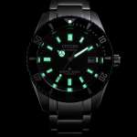 ケースサイズは41mm径×厚さ12.3mmで、風防はサファイアガラス。防水性能は潜水用200m防水で、ベゼルは逆回転防止仕様。りゅうずはねじロック式と、本格的なダイビングに対応するダイバーズ設計。時分針とインデックス、ベゼルの▼マーク内に夜光塗料を配し、夜間暗所での時刻確認もスムーズです。
