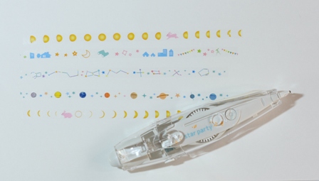 スケジュール帳や日記、ノート、メッセージカードなどの紙の上に引くだけで、月や星、惑星の柄のデコレーションが簡単にできます。使い終わってもテープを詰め替えれば再利用可。