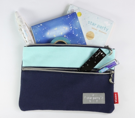 2つのファスナーで仕分けされた大容量ポーチ。メインポケットの裏地には、夏の夜空を彩る天の川が、ジッパープルは三日月のモチーフがプリントされています。夜空と青空をイメージした2トーンカラーで、ペンケースとしても、小物用ポーチとしても使用可能です。