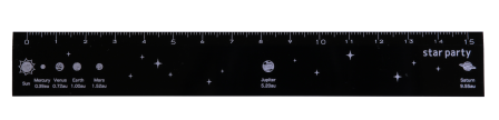 ペンケースにも入れやすい小さめの15cmのアルミ定規。太陽から土星までの距離を15cmに置き換えたデザインで、惑星の距離は太陽からの天文単位(au)で表示されています。