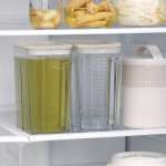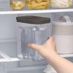 取っ手がないシンプルなデザインで、高さはわずか16cm(サイズ:W8.5×D13.9×H16cm、重量:205g)。これなら冷蔵庫の棚にもそのまま置けて、邪魔になりません。本体側面にくぼみがついているので持ちやすく、スムーズに出し入れできる構造になっています。