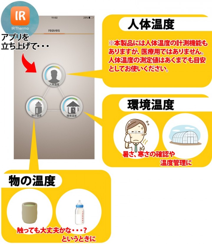 ただし、医療用ではないため人体温度の測定に関しては、あくまで目安に。