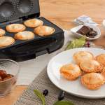本体サイズは幅235×奥行220×高さ100mmとコンパクト。重量は約1.3kgと軽く、持ち運びしやすいのも特徴。一回の調理で6個のパイが出来上がります。