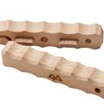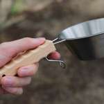 7月12日より発売を予定する「シェラカップグリップ」は、スノーピークのベストセラー「E-103」「E-203」「E-104」に合わせて設計された専用シェラカップハンドル。素材にはナチュラルな風合いの天然木を使用。100×20×30mmサイズのハンドルは縦中央で二つに分かれる仕組みになっていて、内側に掘られた溝部分にワイヤー状の持ち手をぴたっと収めて握り込んで使います。