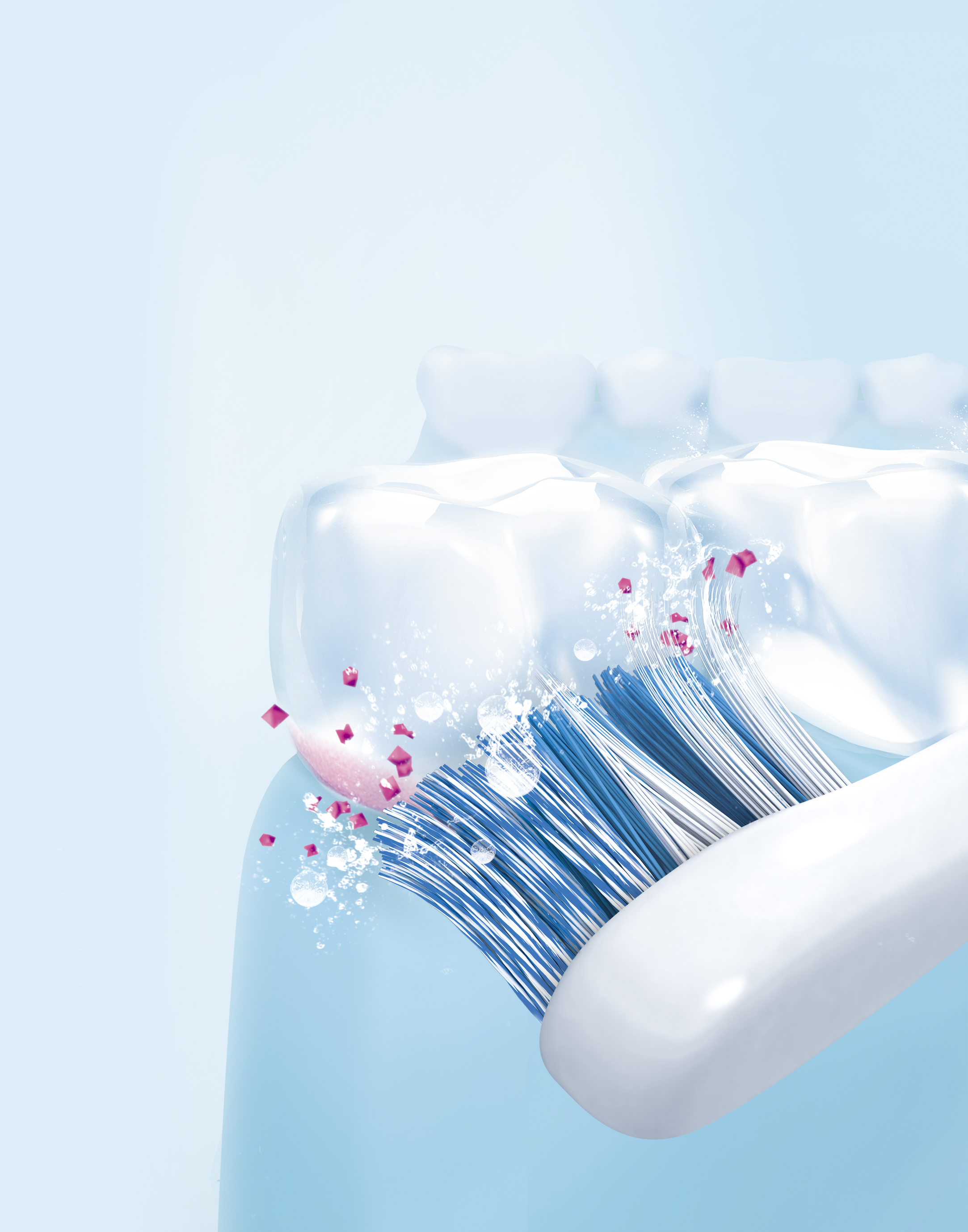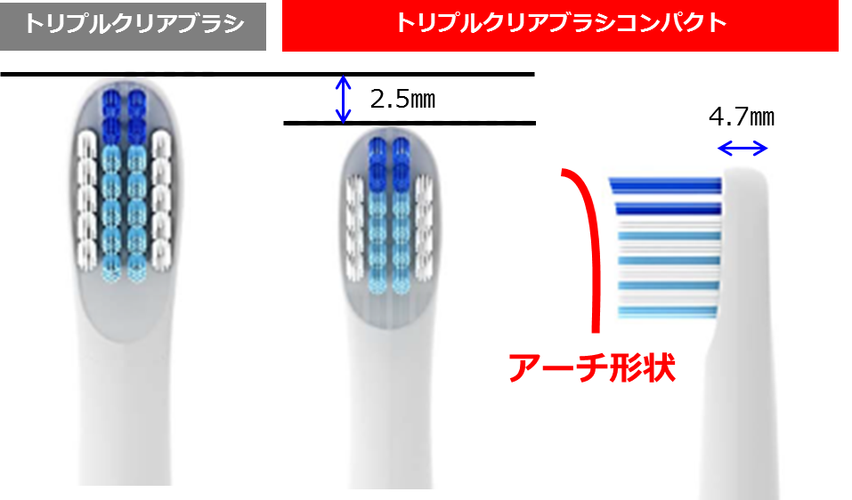 さらに、ブラシ部分を従来品の約20%小型化した、奥歯磨きに適した替えブラシ「トリプルクリアブラシコンパクト」を付属。先端が細いアーチ形状が奥歯の奥まで届いて、歯垢をしっかり掻き出して磨けます。