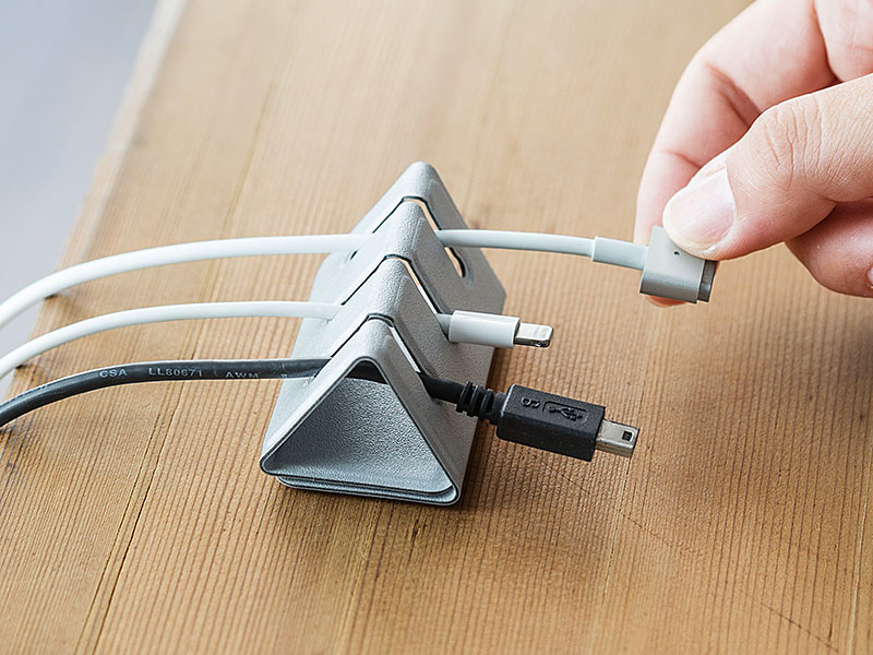 でも、このケーブルホルダーを使えば、最大3本のケーブルをデスクの横にまとめられ、落下の心配もなく絡まりも防止。使用していないケーブルはデスク横で待機! デスクの上は常にスッキリです!