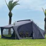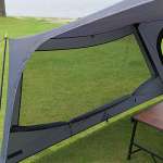 また本体前面パネルは上方向に大きくはね上げるのではなく、ポール2本がせり出すような形で幕体をサポート。前室そのものの高さを抑えることで周囲からの視線を遮ってプライバシーを確保できます。一方でパネルは3面フルメッシュにすることもできるし、巻き上げてトグルで留めればフルオープンにすることも可能。天候やシーンに応じて使い分けられるのが便利です。