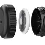 AirTagの取り付けも、丸く空いた穴に嵌め込むだけと非常に簡単。取り外しも同様にスムーズに行えます。サイズは長さ33mm×幅17mm×厚さ2mm、重さは約20g。カラーはこちらもブラックのみとなります。