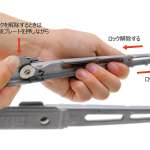 折りたたんだ状態でのサイズは全長28×幅3.5×高さ3.5cmとコンパクト。使用する際はフックを外して、開いた本体の内側からアームを引き出し、軽く引っぱってロックを掛けるだけ。また収納する時は、接続部分の解除用プレートを押しながらハンドル方向へ軽く引っぱるとロックが解除されるので、くるっと回してアームを内側に格納。あとはハンドルを閉じてフックをかければ完了です。
