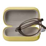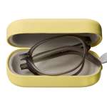 付属するケースはメガネを折り畳んだ状態で収納できる設計で、メガネと同様に小ぶりなサイズ。カバン等の中でもすぐに見つけられるよう、カラーは明るめのクリームイエローが用いられています。また、同梱のセリート(メガネ拭き)もメガネケースに収まる小さめのサイズと、細やかな配慮がなされているのも嬉しいポイントです。