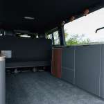 まず、運転席側のサイドキャビネットのサイズはW1487×D301×H650mm(水栓含まず)。天板にはミニシンクと蛇口が付いていて、キャビネット内には電動ポンプと給排水タンクが仕込まれているため、ポータブル電源を繋げば水を流すことが可能。手洗いやちょっとした洗い物をするのに便利です。
