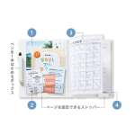 パラパラとめくって閲覧できるヨコ入れポケットと、ページを見開きで固定できるストッパーもあり、ひと目で見やすいのもポイント。裏表紙の内側は、収納したまま書き込めるフラップ付き。ペンを挟めるBOXもついています。