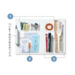 上部のフラップには、これから出す郵便やメモをはさめます。このフラップを収納物にかぶせれば、本体を閉じる時も収納物がこぼれないというフタの役割も果たします。招待状などの一時保管にも便利! 3つのポケットは階段式で、インデックスも付いていて、見やすく分類できます。