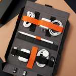 5つ目は便利な伸縮バンド。持ち運ぶことの多いPCやタブレットに伸縮バンドでそのまま取り付けられるため、別途バッグなどを用意する必要がなく、荷物がかさばりません。PCの電源コードやマウスなどを入れて伸縮バンドでセットにしておけば、忘れ物も防げて便利です。