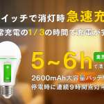 また、“消灯時高速充電”という機能を搭載しており、壁スイッチで切り替えた際、通常点灯時充電のおよそ1/3の時間でフル充電が可能に。約5~6時間で充電できます。