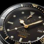 カラーリングはチタン独特のグレートーンを基調とし、全体的に艶を抑えたダイバーズらしい“道具感”を強調。縦筋目仕上げを施した濃いグレー色の文字板にはゴールドで彩ったオリエントスターのロゴを配置し、回転ベゼルの目盛りや数字にも梨地のゴールドを用いています。
