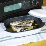 魚料理は魚をまるごと本体に入れ、蓋をして電子レンジで温めるだけでOK。サイズはW285×D177×H98mm、重さ495gで横幅がしっかりとあるため、2~3人前の料理を作りたいときにも活躍します。