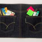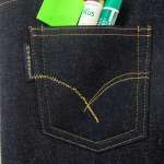 ジーンズの顔とも称されるヒップポケットのステッチや、オリジナルロゴのピスネーム(タグ)にも同じものを使用しています。ポケットは左右についており、ふせんやリップなどの小物を実際に収納できます。