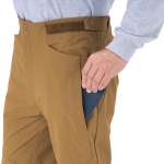 ストレッチ性があり、脚の動きを邪魔しないムービングカット仕様で、起伏が大きい山道の歩行をスムーズに行えます。ウエスト部分には面ファスナー仕様のサイドアジャスターを配し、体型に合わせた締め具合の調節が可能。太腿部まで深さがある大容量ポケットを含む計6個のポケットを搭載しています。