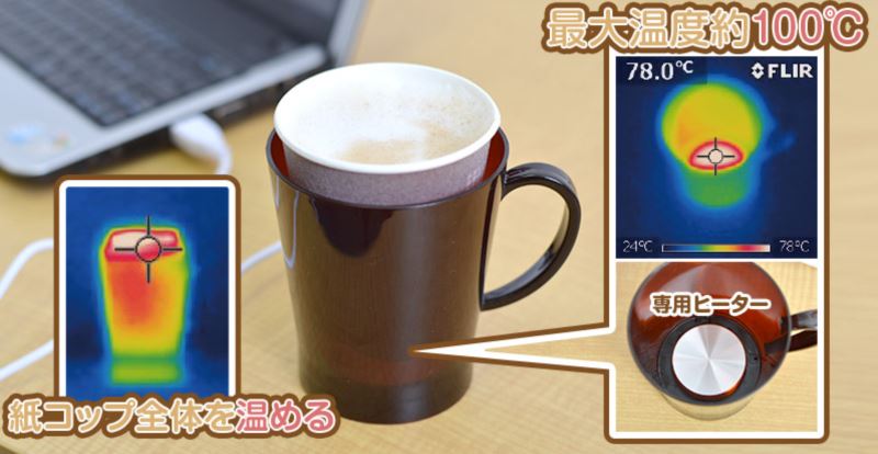 カップの底にある保温ヒーターが紙コップ底面にしっかりと密着し、飲み頃温度の60~70℃をキープ。ヒーターは温度が100℃に達したら自動的に電力供給を切り、70℃以下になると再給電する安全装置付き。