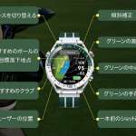 ショットする位置の傾斜を考慮して実際に打つべき距離を計算する「傾斜補正表示」や、1打前の飛距離を表示させる機能、ホールの地形や過去のデータを基に最適な狙いどころとクラブの提案、グリーンの傾斜と方向など、スコアアップに直結する詳細データを瞬時に表示します。