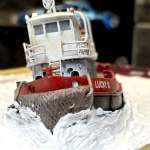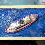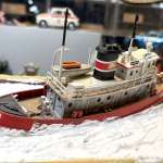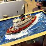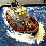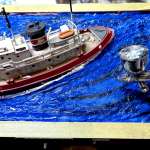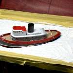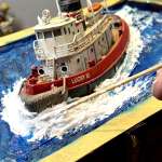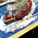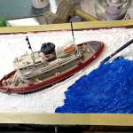 ▲船首の波を増量したことで、タグボートの力強さ画より強調された。奥側の海面はまだ白を使ってのドライブラシで波頭を入れていない。ドライブラシで波頭を強調した手前側海面と比べるとのっぺりと見えてしまう