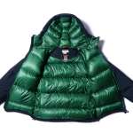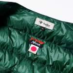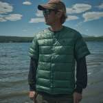 表地にはリップストップ15D(ナイロン生地)を採用。引っ張り強度や軽量性、コンパクトさに優れ、パッキングも容易に行えます。中材のダウンにはリサイクルダウンを60g(ダウン90%・フェザー10%)封入。首回りのボリュームを抑えたカーディガンタイプで、ネックウォーマー等との相性も良好。カラーはこちらもグリーンとブラックの2色展開。サイズはM/L/XLの3種類です。