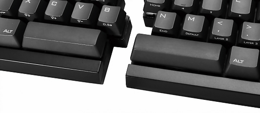 スゴイのはそれだけじゃありません。ハードウエアマクロ機能により、キー配置を3つ設定できるようになっています。左右の両ユニットに配されているスペースキーに別々のキーを割り当てたり、右側ユニットだけに左側ユニットを含めたすべてのキー入力操作を割り当てることもできるんです!